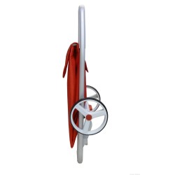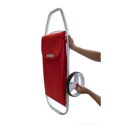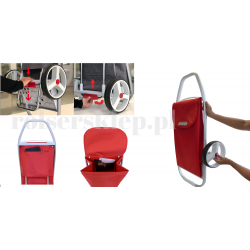 Bardzo prosto ściągane kółka -przez naciśnięcie czerwonego przycisku na kole, wózek nie zajmuje dużo miejsca gdy nie jest użytkowany.